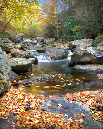 Description: A natural whirlpool under the vibrant color of the fall foliage in the mountains of western North Carolina.
