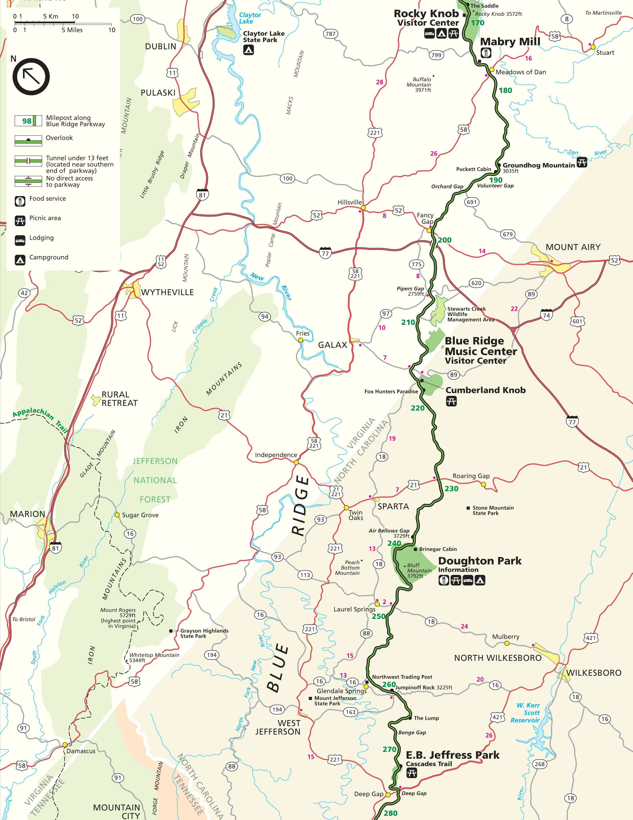 Attractions: Doughton Park, Blue Ridge Music Center, Cumberland Knob, E.B. Jeffress Park, Mabry Mill